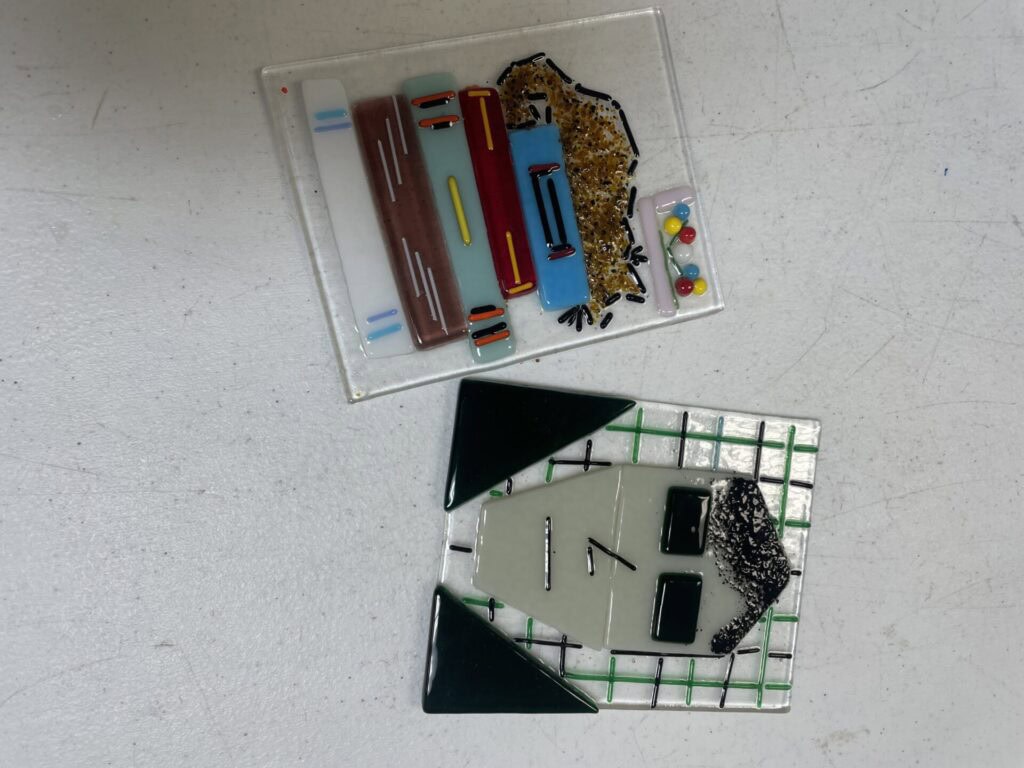 Participants start with a clear glass “blank” about 1.5×1.5″. After a brief overview and safety talk, it is completely up to the individual on what their design will look like. Pieces are all pre-cut and ready to be glued on. Projects stay at the museum for 10-14 days to be fired in a kiln. After firing, a jewelry bail is glued on and a key ring is attached if desired. Projects take about 30 minutes. $5 per project.