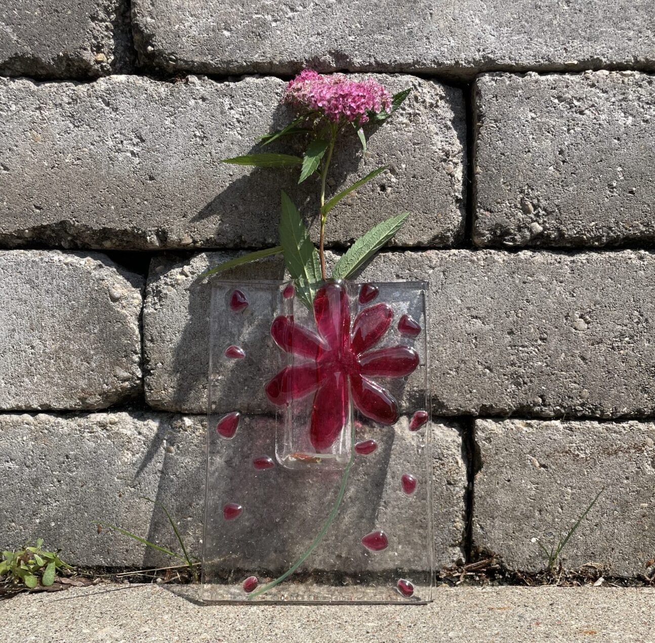 Design and create your own functional bud vase! Students will decorate the face of the vase and afterwards, the studio will slump it between two layers of glass with a pocket space left open in the center to hold flowers. Add optional copper wire to hand it on the wall or on a window.